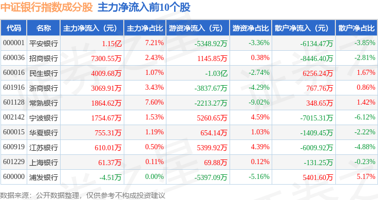 资金流向方面,中证银行(399986)指数成份股当日主力资金净流出合计7.3亿元,游资资金净流入合计1.6亿元,散户资金净流入合计5.71亿元。成份股资金流向详情见下表: