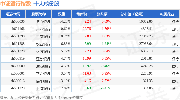 证券之星消息,10月23日,中证银行(399986)指数报收于7735.85点,涨0.65%,成交424.42亿元,换手率0.45%。当日该指数成份股中,上涨的有26家,邮储银行以4.71%的涨幅领涨,下跌的有10家,农业银行以1.24%的跌幅领跌。