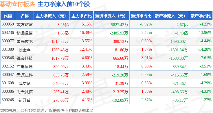 从资金流向上来看,当日移动支付板块主力资金净流出7.48亿元,游资资金净流入1.2亿元,散户资金净流入6.28亿元。移动支付板块个股资金流向见下表:
