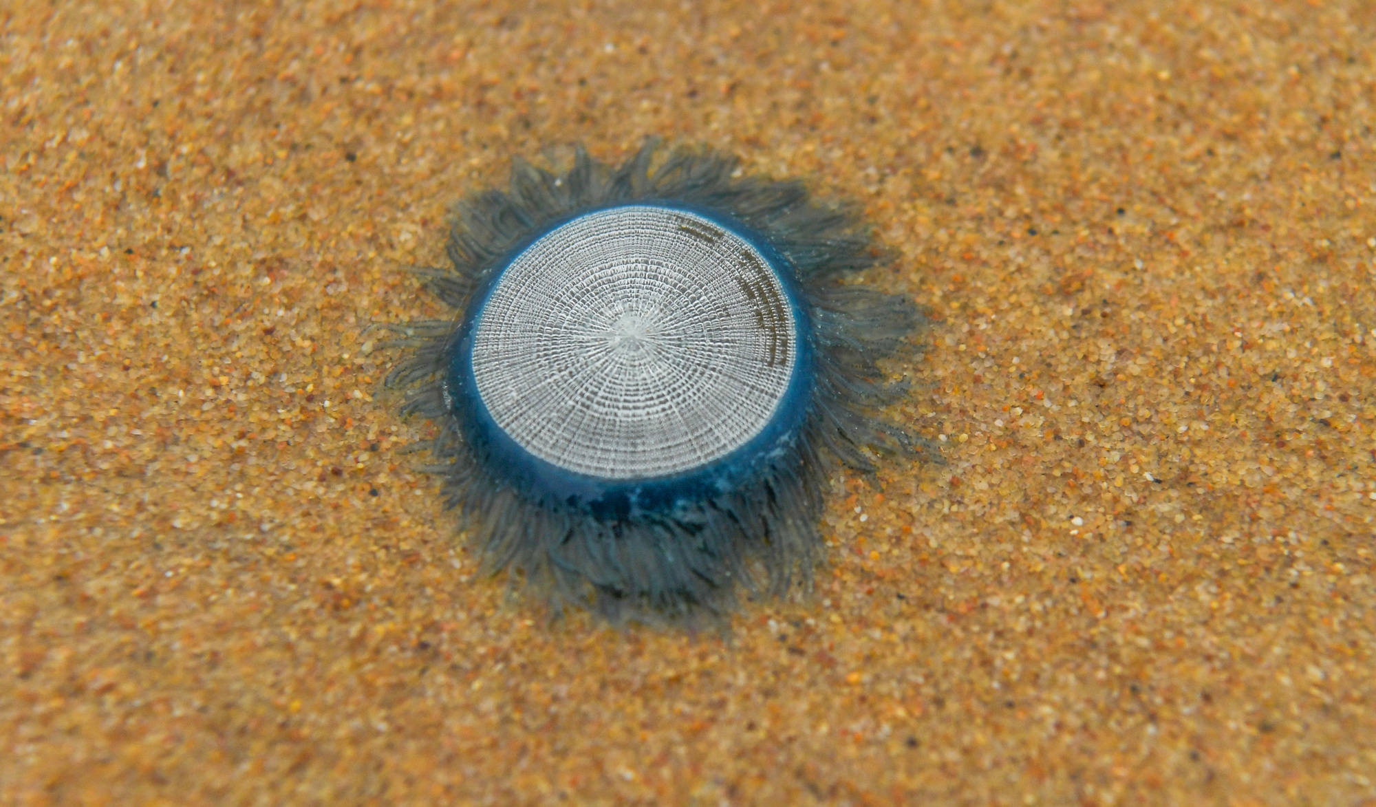 经海口市资规局联同海南省海洋监测预报中心专家取样鉴定,这些圆形蓝色生物为银币水母,其浮囊体硬而透明,质轻呈圆盘状,触手上有刺丝囊,毒性相对较弱。该物种自身无游泳能力,其移动完全依赖海流驱动,本次银币水母上岸原因,或是受台风“风神”影响,被强风和大浪推上海岸。