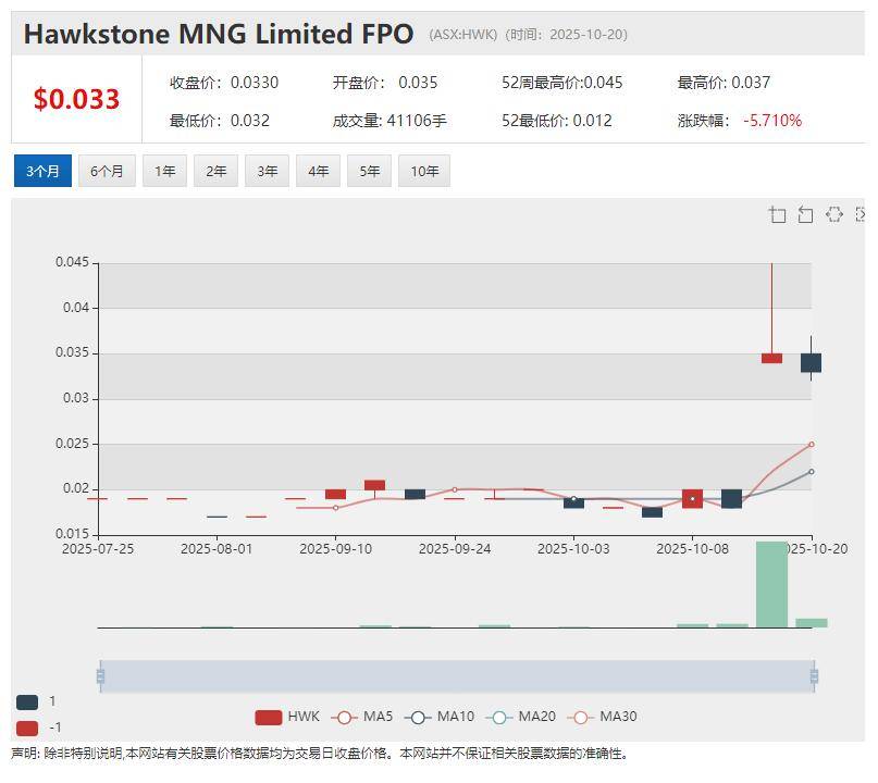 澳华财经在线数据库显示,HWK最新价0.035澳元,已发行股本2.71亿股,市值948万澳元。