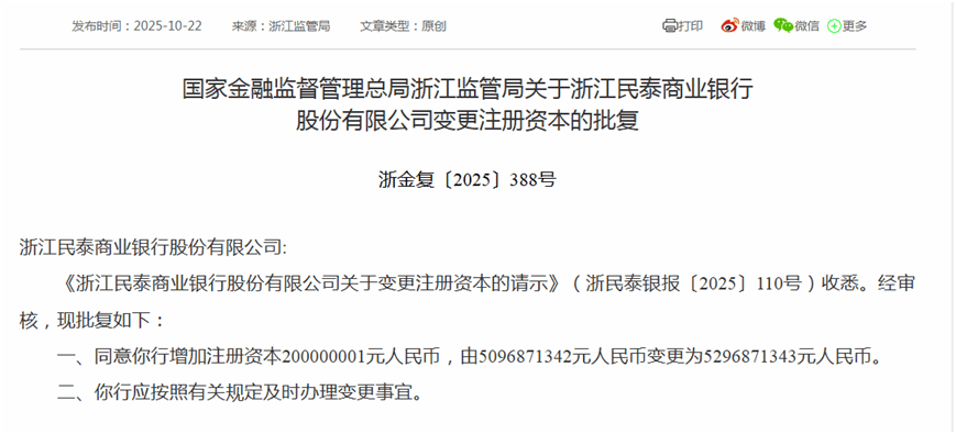 蓝鲸新闻10月23日讯(记者 金磊)10月22日,国家金融监督管理总局浙江监管局发布批复,同意浙江民泰商业银行(以下简称民泰银行)增加注册资本约2亿元,由约50.97亿元变更为约52.97亿元。