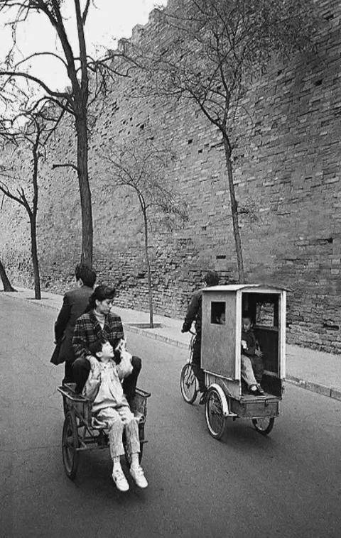 有一组作品,叫《胡同春秋》,捕捉了老北京从计划经济到改革开放的变迁:一个老太太在院子里纳鞋底,身后是刚拉起的电线杆;一群青年围着收音机,听邓小平讲话的剪辑版。