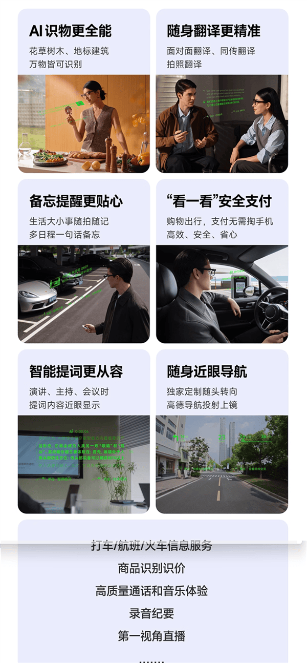 夸克AI眼镜支持通话、音乐、翻译、备忘录、日程提醒、提词以及拍照问答等主流功能。