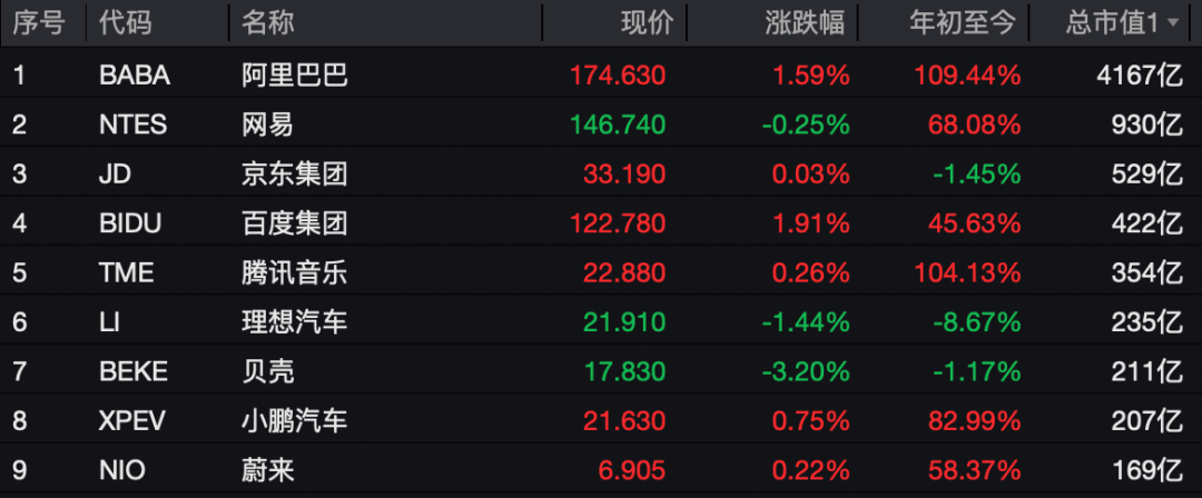 中概股微涨0.2%。个股方面,文远知行涨5.1%,阿里巴巴涨1.5%。