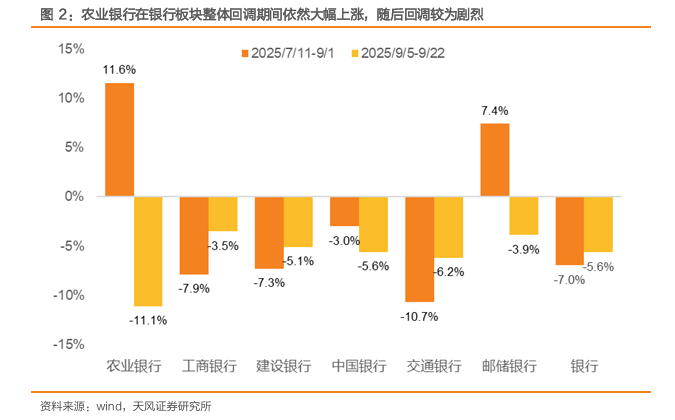 2025/9/5-9/22,农业银行股价曾出现大幅回调,期间累计下跌 11.1%,远高于同期其他国有大行。