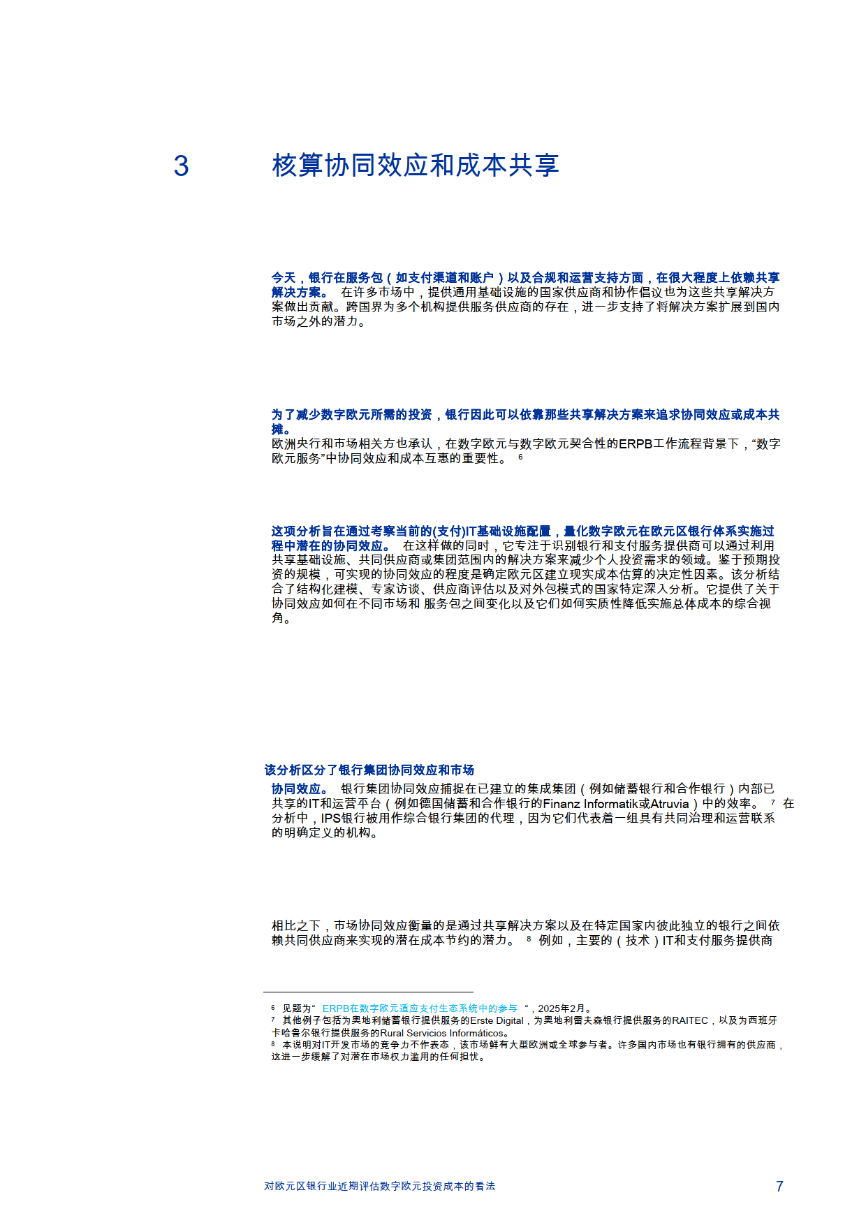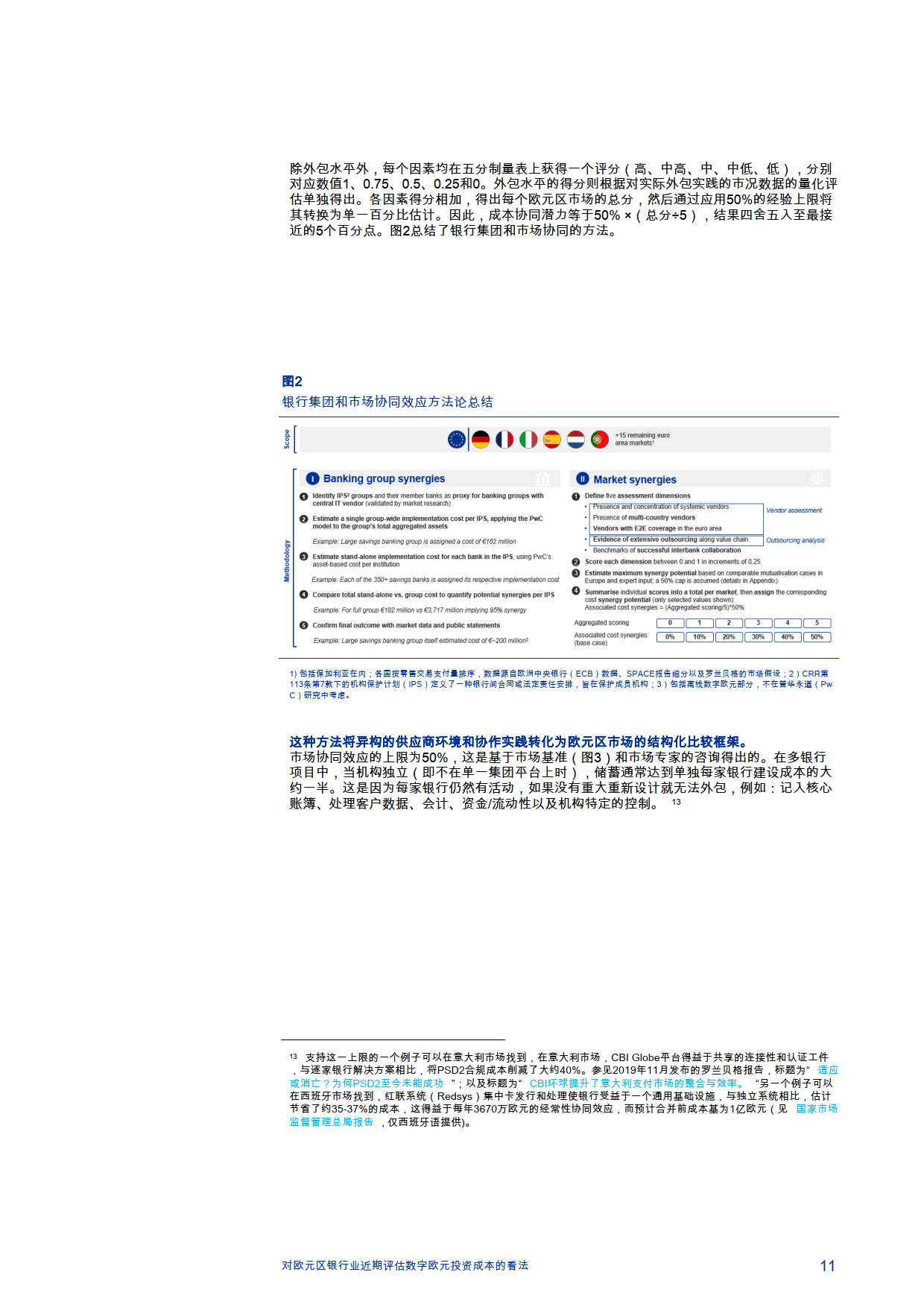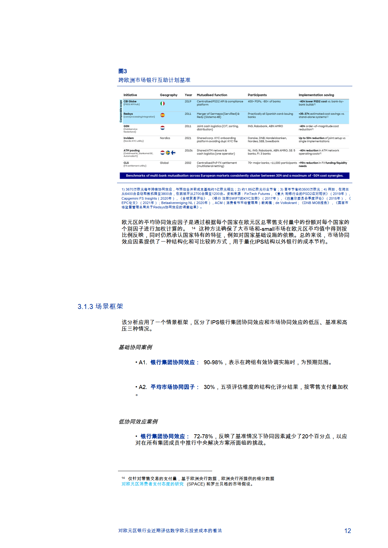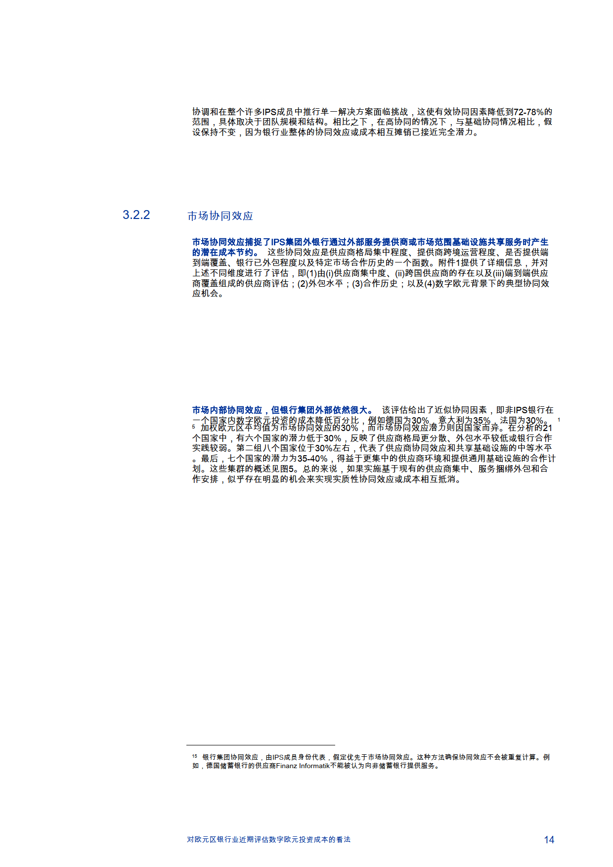 协同效应是降低投资成本的关键,报告将其分为银行集团协同效应和市场协同效应。银行集团协同效应方面,机构保护计划(IPS)成员银行通过共享IT和运营平台,可实现90%-98%的成本节约,低协同场景下仍可达72%-78%。市场协同效应因国家而异,德国、法国等主要市场约30%,意大利、荷兰等达35%,芬兰、斯洛文尼亚最高达40%,欧元区加权平均为30%,高协同场景下可提升至40%。这些协同效应主要通过共享供应商、外包服务、联合基础设施等方式实现,符合支付行业现有实践。