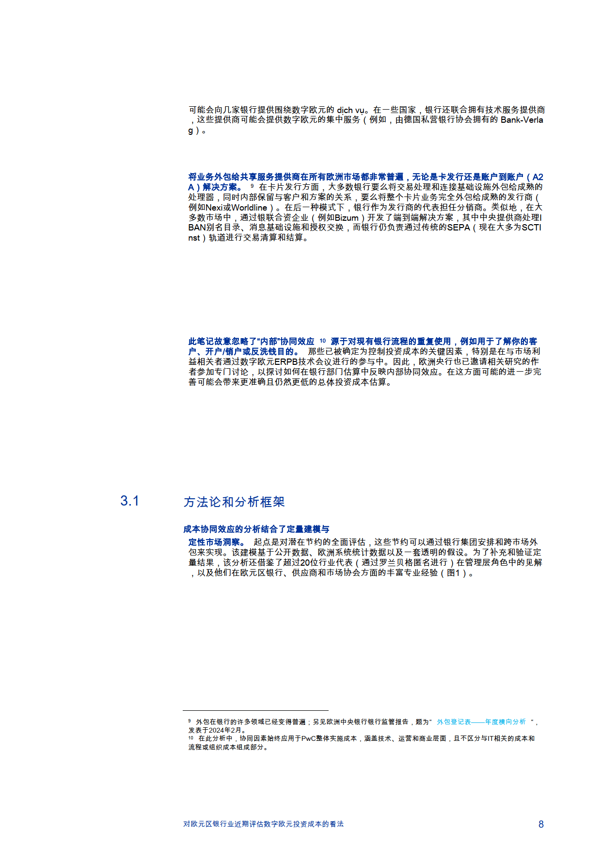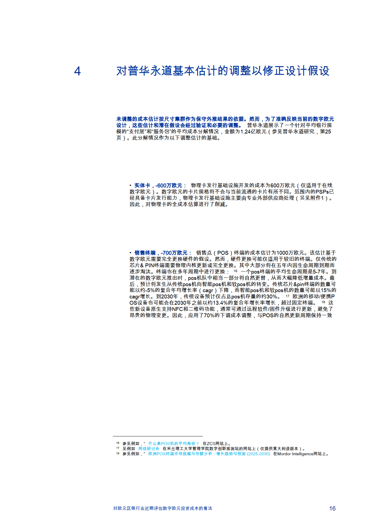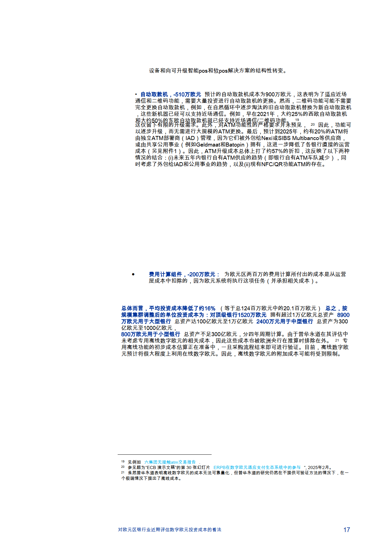 普华永道(PwC)受欧洲信贷行业机构委托,基于9个欧元区市场19家银行样本,估算总投资成本达180亿欧元,该数据因未充分考虑协同效应和数字欧元设计特点,显著高于其他行业研究。欧洲央行对其估算进行调整,扣除实体卡、销售终端、自动取款机等无需额外投入的成本,以及由欧元系统承担的费用计算组件成本,最终使平均投资成本降低约16%,调整后不同规模银行四年周期单位投资成本分别为:顶级银行1520万欧元、大型银行8900万欧元、中型银行2400万欧元、小型银行800万欧元。