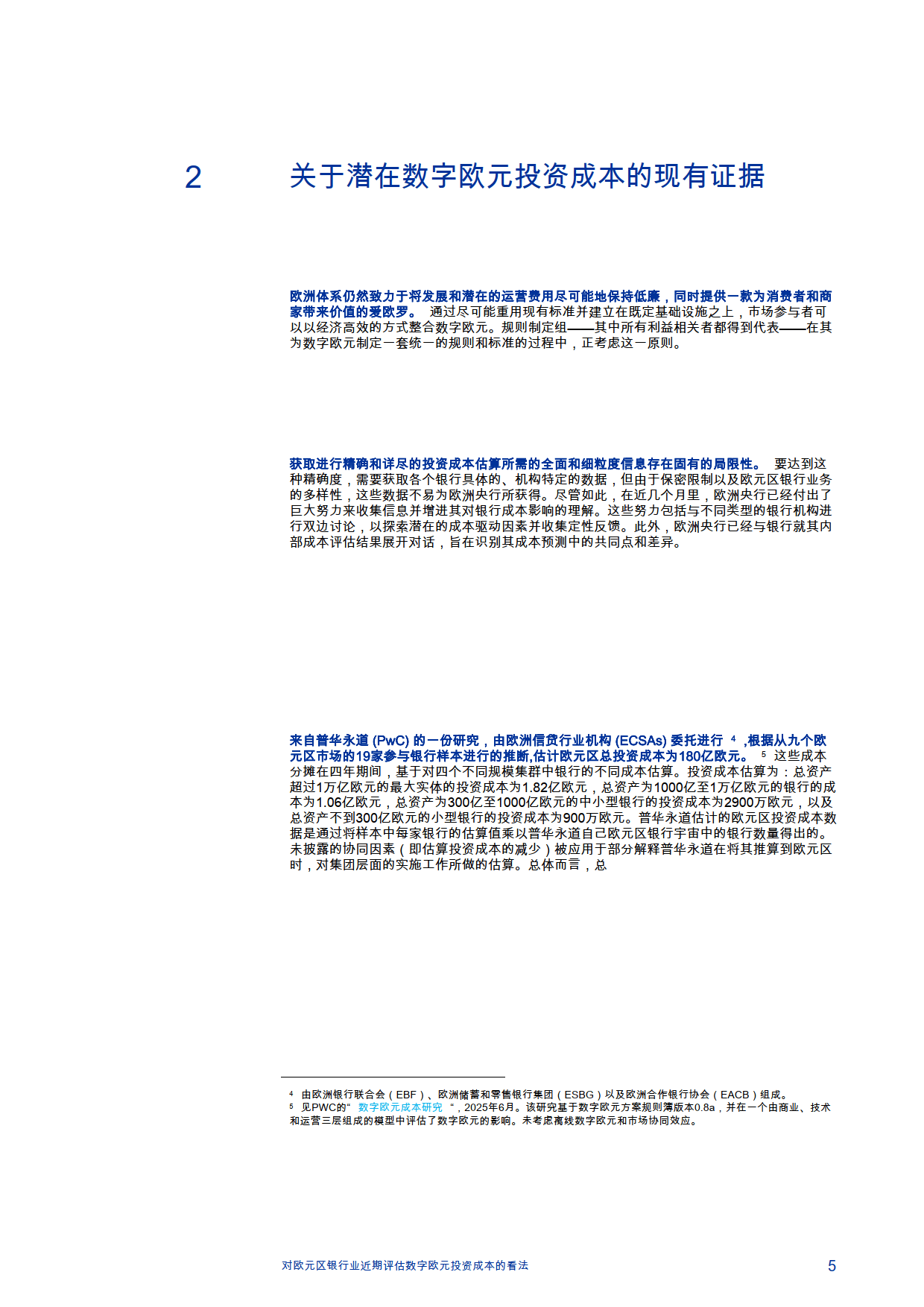 2025年10月,欧洲中央银行发布报告,针对欧元区银行业数字欧元投资成本进行全面评估,核心结论为:充分考虑协同效应与成本共享后,未来四年数字欧元总投资成本预计在40亿欧元至57.7亿欧元之间,年均10亿欧元至14.4亿欧元,接近欧盟委员会2023年评估的上限(28亿欧元至54亿欧元),且与支付服务指令(PSD2)成本相当,远低于单一欧元支付区(SEPA)水平。