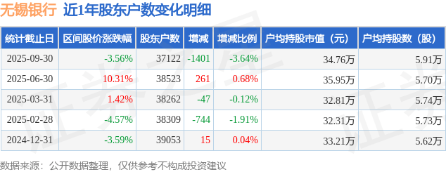 从股价来看,2025年6月30日至2025年9月30日,无锡银行区间跌幅为3.56%,在此期间股东户数减少1401.0户,减幅为3.64%。