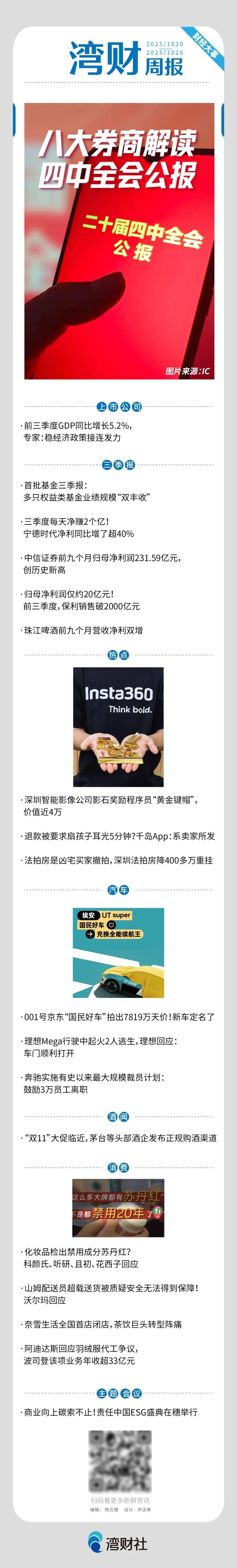 湾财周报|大事记 券商解读四中全会公报;影石奖励员工“黄金键帽”,价值近4万;上市公司集中披露三季报