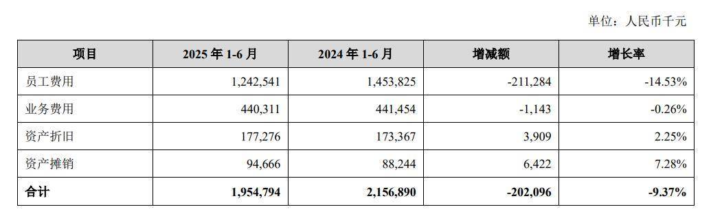 2025年上半年,苏州银行的业务及管理费用为19.55亿元,较上年同期减少2.02亿元,降幅9.37%。其中,员工费用12.43亿元,较上年同期的约14.54亿元减少2.11亿元,同比降幅14.53%;而其业务费用4.40亿元,较上年同期仅减少114.3万元,同比降幅仅0.26%。