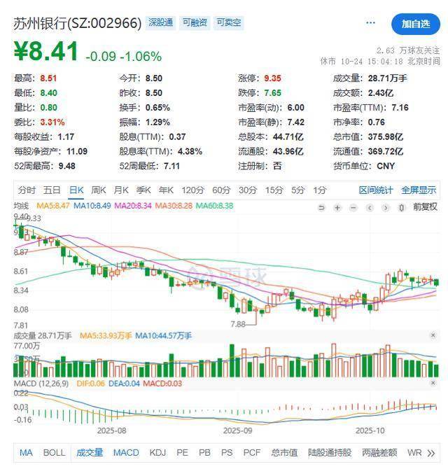 瑞财经 李兰10月24日,截至收盘,苏州银行(002966.SZ)股价报8.41元/股,总市值为375.98亿元,这一价格仍不及其上市首日高点。