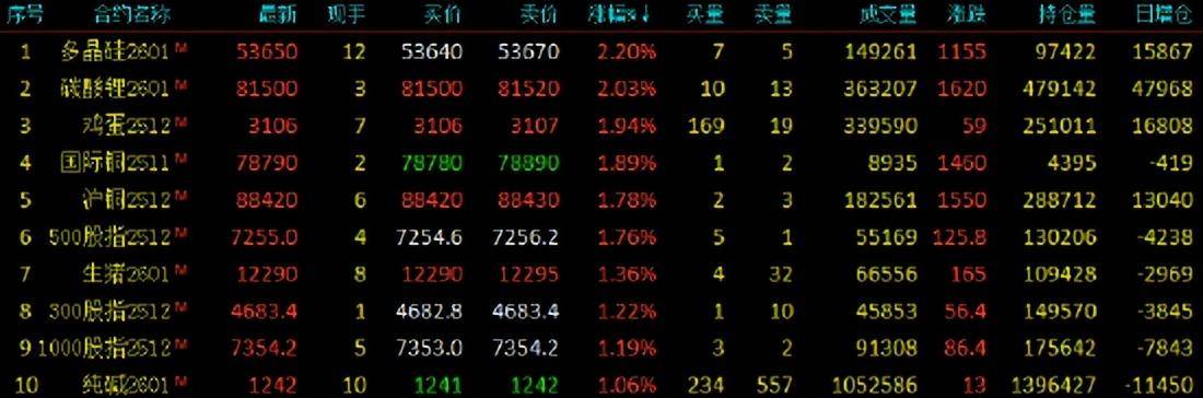 2025年10月27日,早盘收盘,国内期货主力合约涨跌互现。碳酸锂、多晶硅涨超2%,鸡蛋、沪铜、国际铜、生猪、纯碱涨超1%。跌幅方面,原木跌超4%,红枣跌超2%,丁二烯橡胶、集运欧线、苯乙烯(EB)、沪金跌超1%。