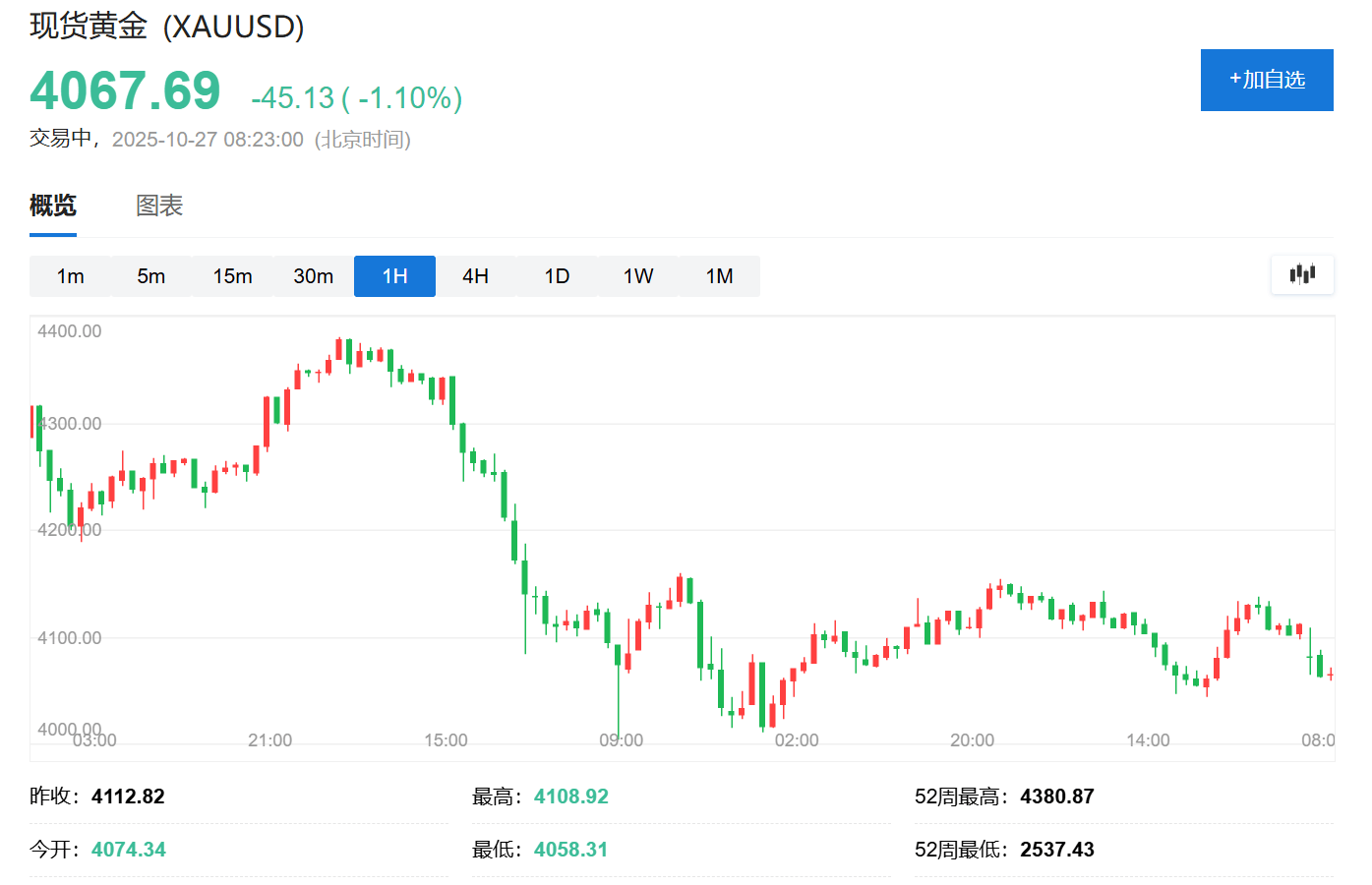受周末贸易局势消息影响,10月27日早间,黄金开盘后突然跳水。