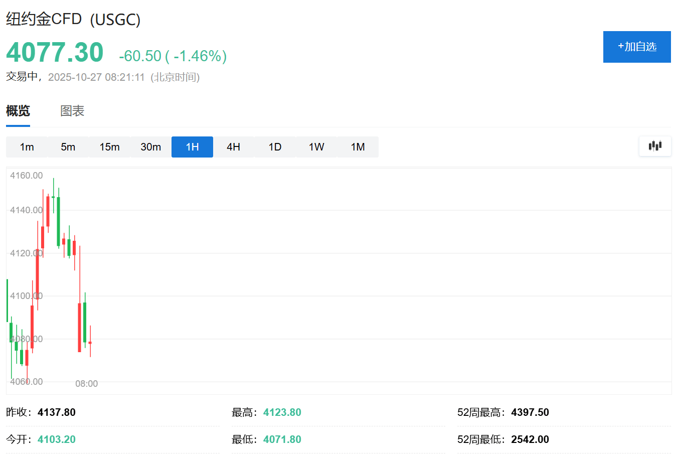 截至发稿,COMEX黄金期货下跌1.46%,报4077.3美元/盎司。现货黄金也下跌1.1%,报4067.69美元/盎司。