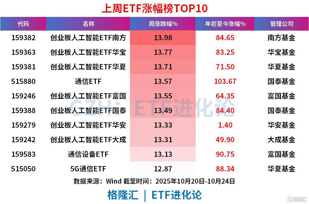 创业板人工智能ETF南方、创业板人工智能ETF华宝、创业板人工智能ETF华夏、通信ETF、创业板人工智能ETF富国、创业板人工智能ETF国泰、创业板人工智能ETF华安、创业板人工智能ETF大成、通信设备ETF上周涨超13%。