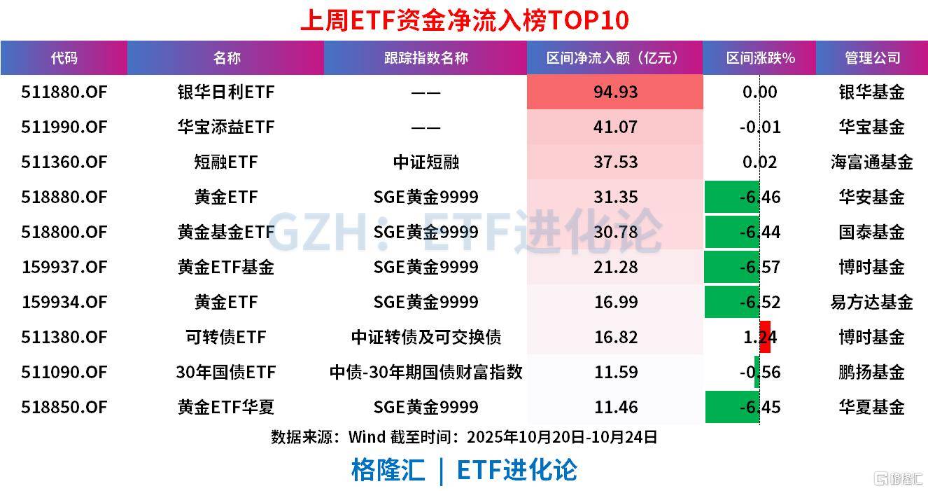 具体ETF产品方面,银华日利ETF、华宝添益ETF、短融ETF、黄金ETF、黄金基金ETF、黄金ETF基金上周分别净流入94.93亿元、41.07亿元、37.53亿元、31.35亿元、30.78亿元、21.28亿元。