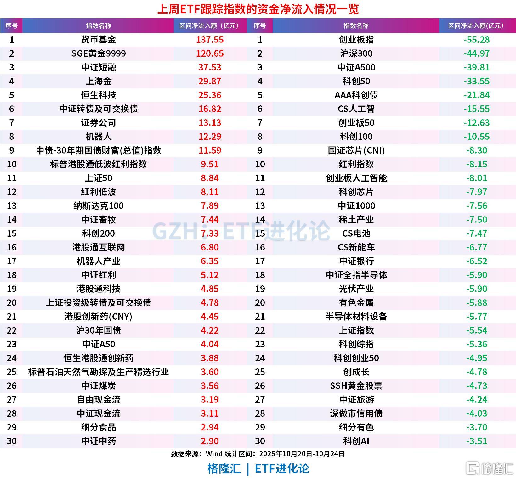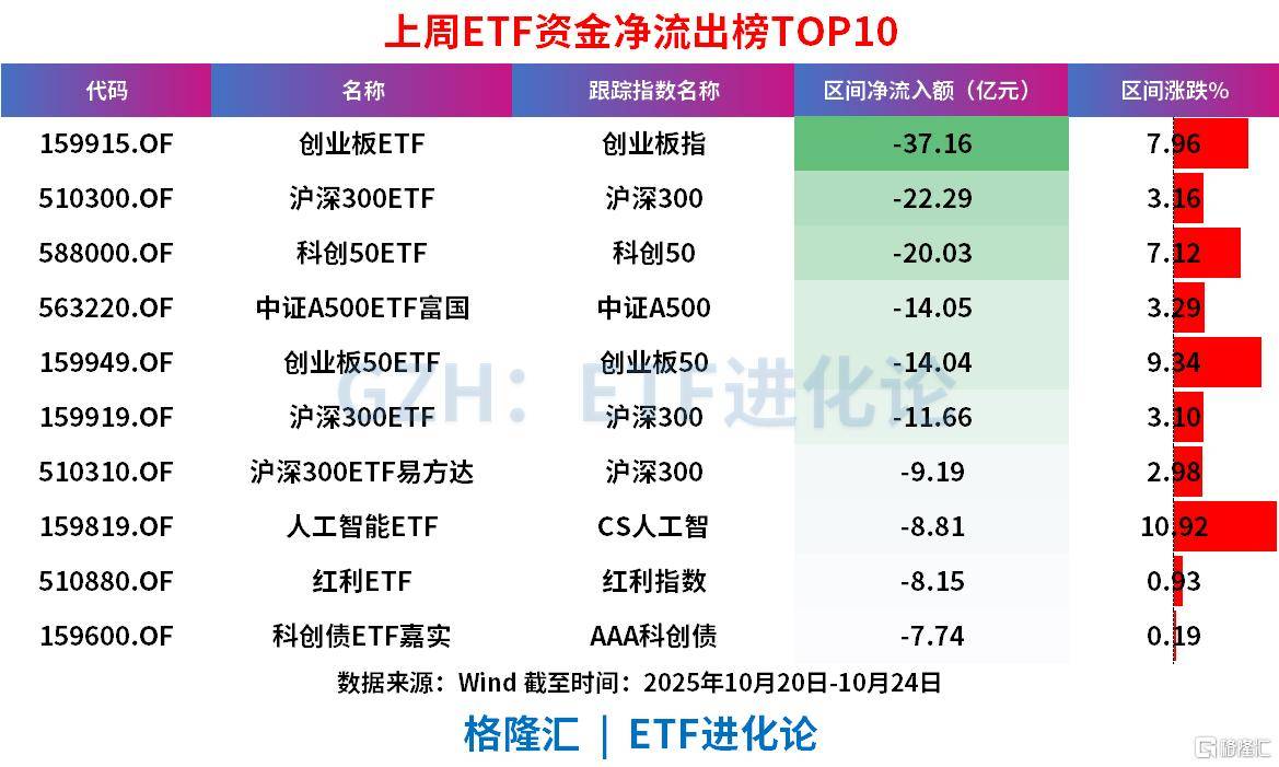 创业板ETF、沪深300ETF、科创50ETF、中证A500ETF富国、创业板50ETF、沪深300ETF上周分别净流出37.16亿元、22.29亿元、20.03亿元、14.05亿元、14.04亿元、11.66亿元。