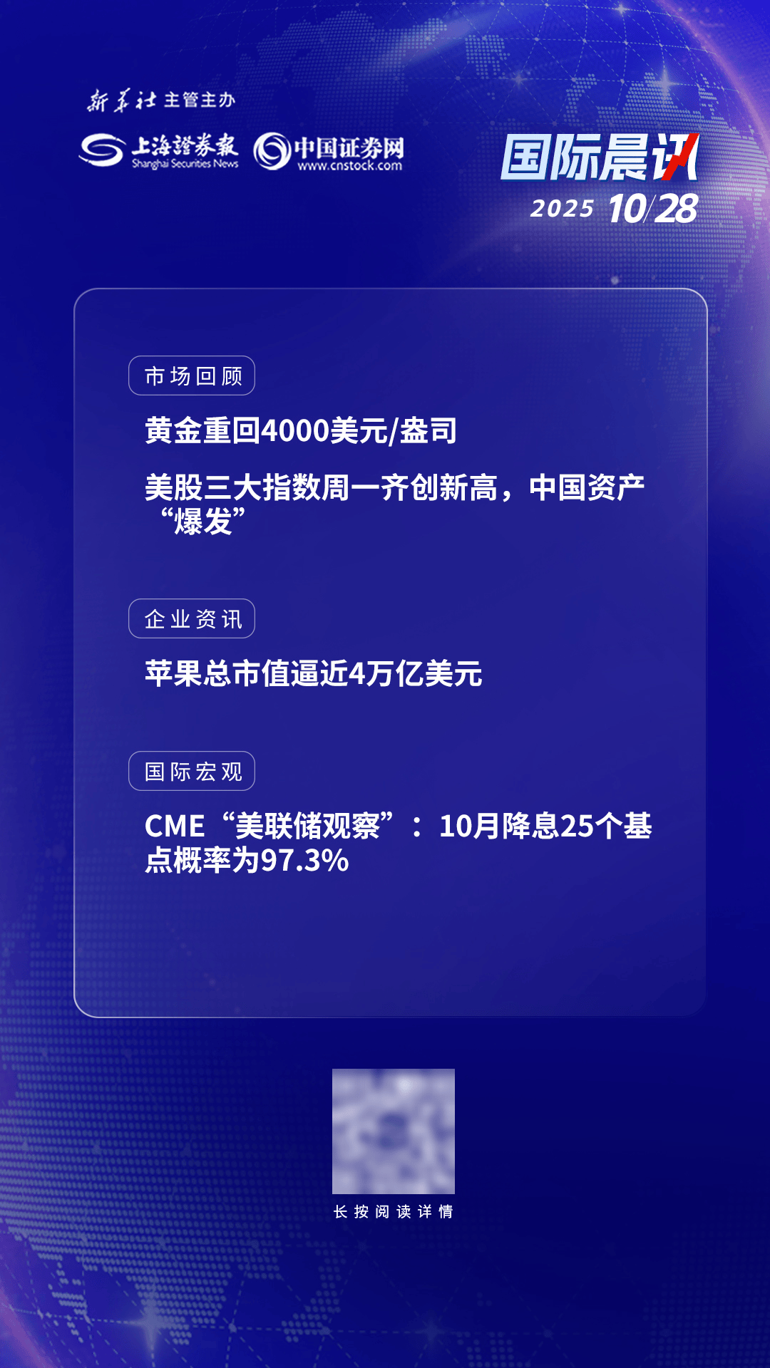 北京时间10月28日早盘,伦敦现货重新站上4000美元/盎司关口;美股三大指数周一齐创新高,中国资产“爆发”,苹果总市值逼近4万亿美元,据CME“美联储观察”最新统计,美联储10月降息25个基点的概率为97.3%。