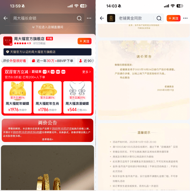 周大福方面也曾表示,考虑到金价持续上涨对成本的影响,集团计划在10月底提高定价黄金产品的零售价格,其中大多数产品的提价幅度预计在12%至18%。28日,上游新闻记者注意到,周大福在电商平台上发布了调价公告:“本店部分定价黄金产品将于2025年10月27日起执行价格上调,并预计于2025年10月28日24:00前全部调整完毕。”