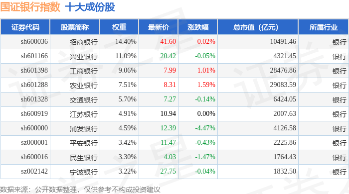证券之星消息,10月28日,国证银行(399431)指数报收于8093.6点,跌0.17%,成交310.45亿元,换手率0.31%。当日该指数成份股中,上涨的有7家,农业银行以1.59%的涨幅领涨,下跌的有20家,浦发银行以4.47%的跌幅领跌。