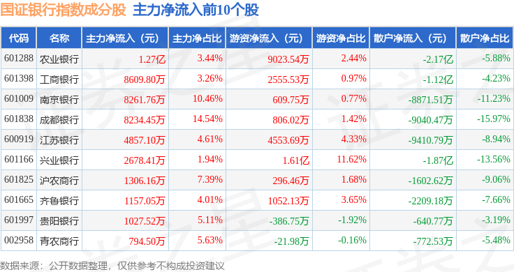 资金流向方面,国证银行(399431)指数成份股当日主力资金净流出合计7.24亿元,游资资金净流入合计12.03亿元,散户资金净流出合计4.79亿元。成份股资金流向详情见下表:
