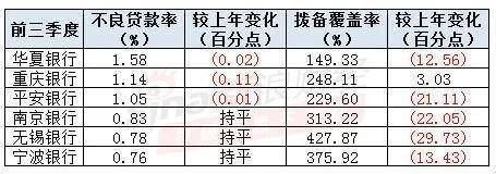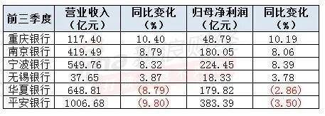 继率先发布三季报后,、重庆银行、、、等陆续披露了相关报告。整体来看,六家绩表现稳健,其中,四家城农商行均实现了前三季度营收与净利润的双增,而两家股份行则有所收窄。另外,六家银行资产质量普遍好转,截至三季度末,华夏银行、平安银行、重庆银行不良贷款率均较上年末下降,其他银行则持平。