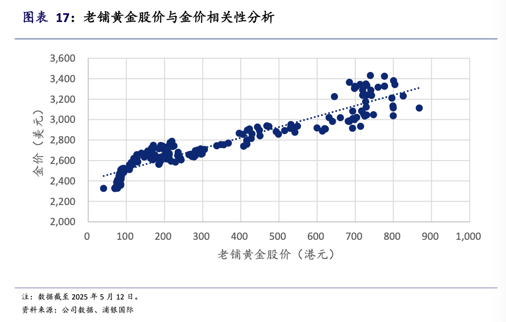 此外,浦银国际的研究显示,老铺的股价与金价之间具有非常高的相关性(相关系数R达到0.94)。