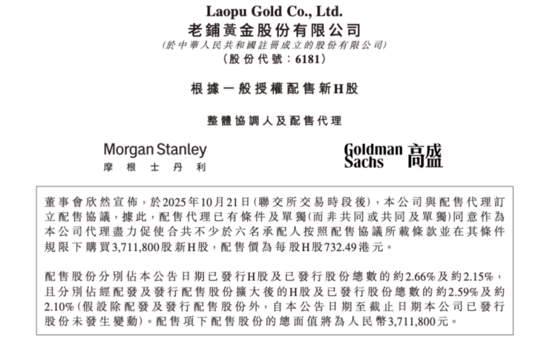 10月22日,老铺黄金宣布以每股732.49港元配售371万股新H股,募资净额约27.07亿港元。