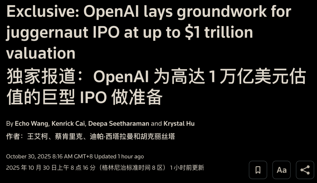 当尘埃落定、OpenAI真的敲响上市钟声时,人们或许会意识到:这场万亿美元的豪赌,押上的不仅是OpenAI的未来,更是整个AI时代的走向。
