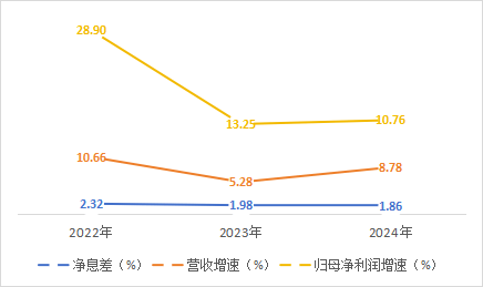 2022年至2024年,江苏银行的净息差从2.32%收窄至1.86%,营业收入增速从10.66%下降至8.78%,归母净利润增速从28.89%下降至10.76%。