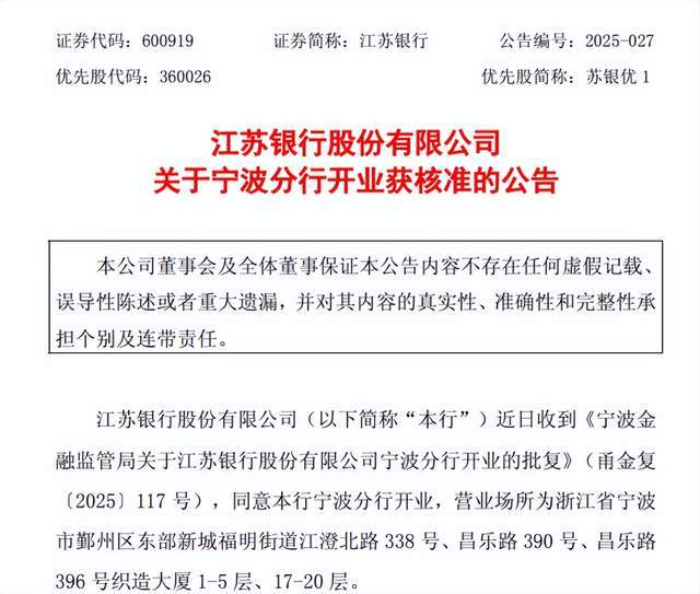 随着宁波金融监管局批复同意,江苏银行也对应披露相关信息。