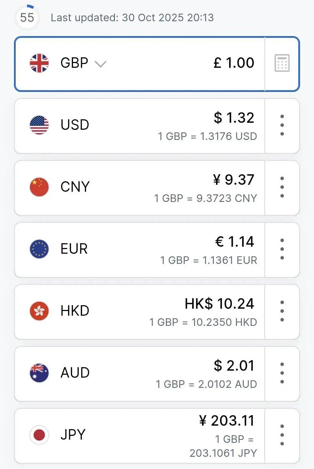 截至发文时(2025年10月30日),英镑最新汇率情况如下: