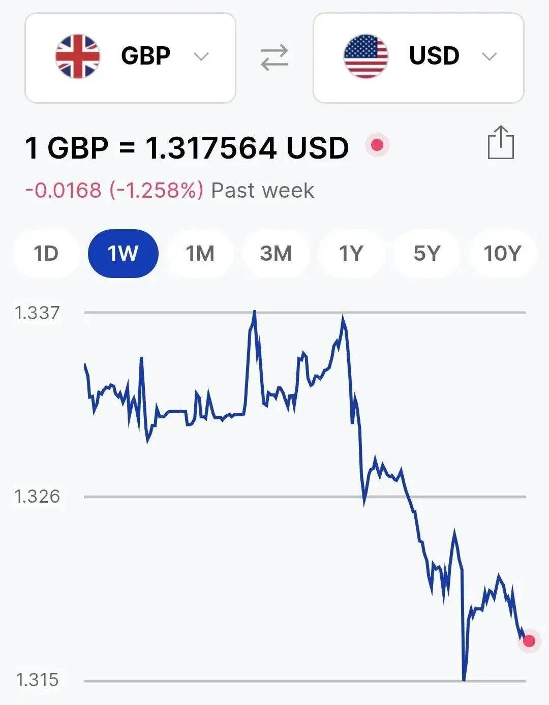 过去一周以来,英镑汇率持续走低,兑美元汇率从1.337跌至最新的1.317。
