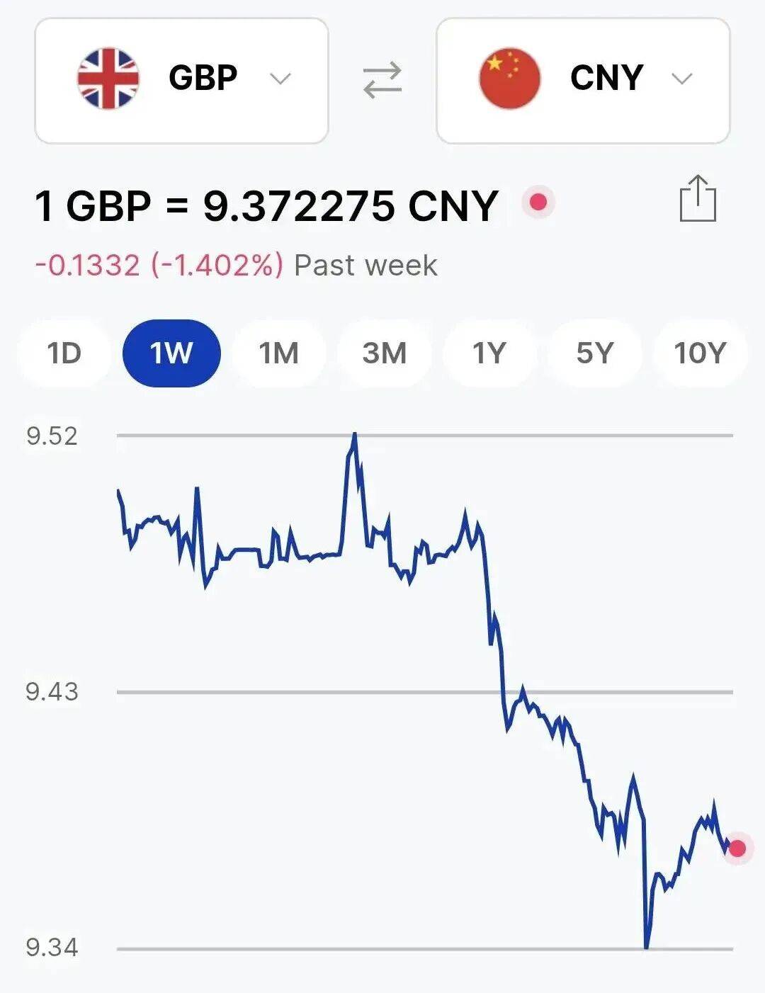 英镑兑人民币汇率在过去一周从9.52跌至9.37。