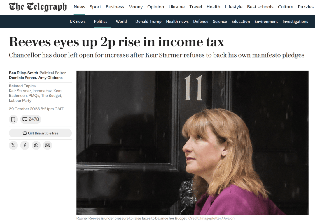 据每日电讯报10月29日最新披露,英国财政大臣里夫斯正在考虑将个人所得税率(income tax)提高2个百分点,同时将国民保险税率(National Insurance)降低2个百分点。