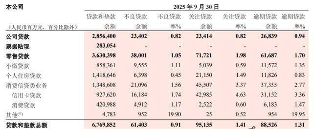 截至2025年9月末,招商银行整体不良贷款余额674.25亿元,较上年末增加18.15亿元,不良贷款率0.94%,较上年末下降0.01个百分点。