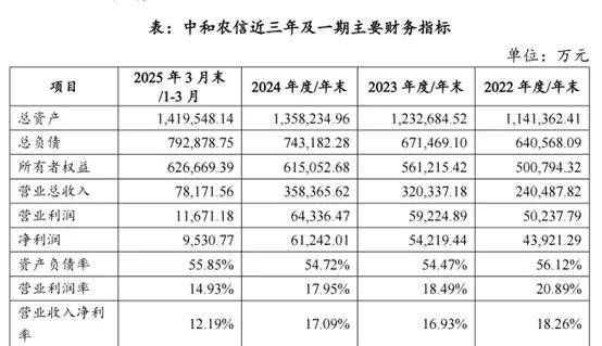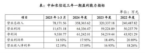 2022年、2023年、2024年及2025年1-3月,中和农信营业总收入主要为利息及手续费收入,营业总收入金额分别为24.05亿元、32.03亿元、35.83亿元和7.81亿元;2022年、2023年、2024年及2025年1-3月,中和农信净利润分别为4.39亿元、5.42亿元、6.12亿元和0.95亿元。可以看出,2025年一季度净利润并不高。