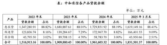 具体来看,2022年度-2024年度以及2025年一季度,中和农信放款金额分别为227亿元、276亿元、294亿元和59亿元;2022-2024年末以及2025年3月末贷款余额分别为152亿元、191亿元、196亿元和183亿元。