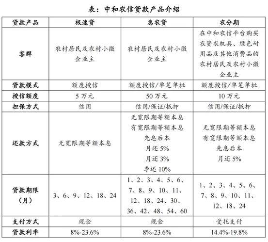 按照支用模式,中和农信贷款产品分为极速贷、惠农贷、农分期三类产品,获客渠道为下属分支机构客户经理的线下推广和线上线下渠道的广告,使用中和农信统一风控系统。极速贷为小额循环授信类个人贷款。惠农贷为大额循环授信类个人贷款。农分期为受托支付个人贷款,贷款资金仅可用于向乡助APP商家支付采购进货款。