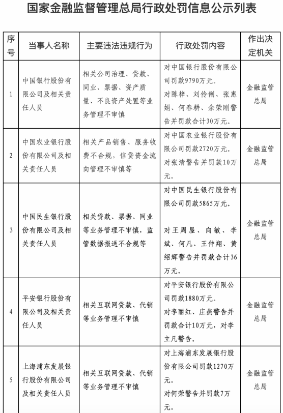 据上海证券报记者统计,中国银行、农业银行、民生银行、平安银行、浦发银行等5家金融机构被罚款超2.15亿元。相关负责人员被警告或处以罚款。