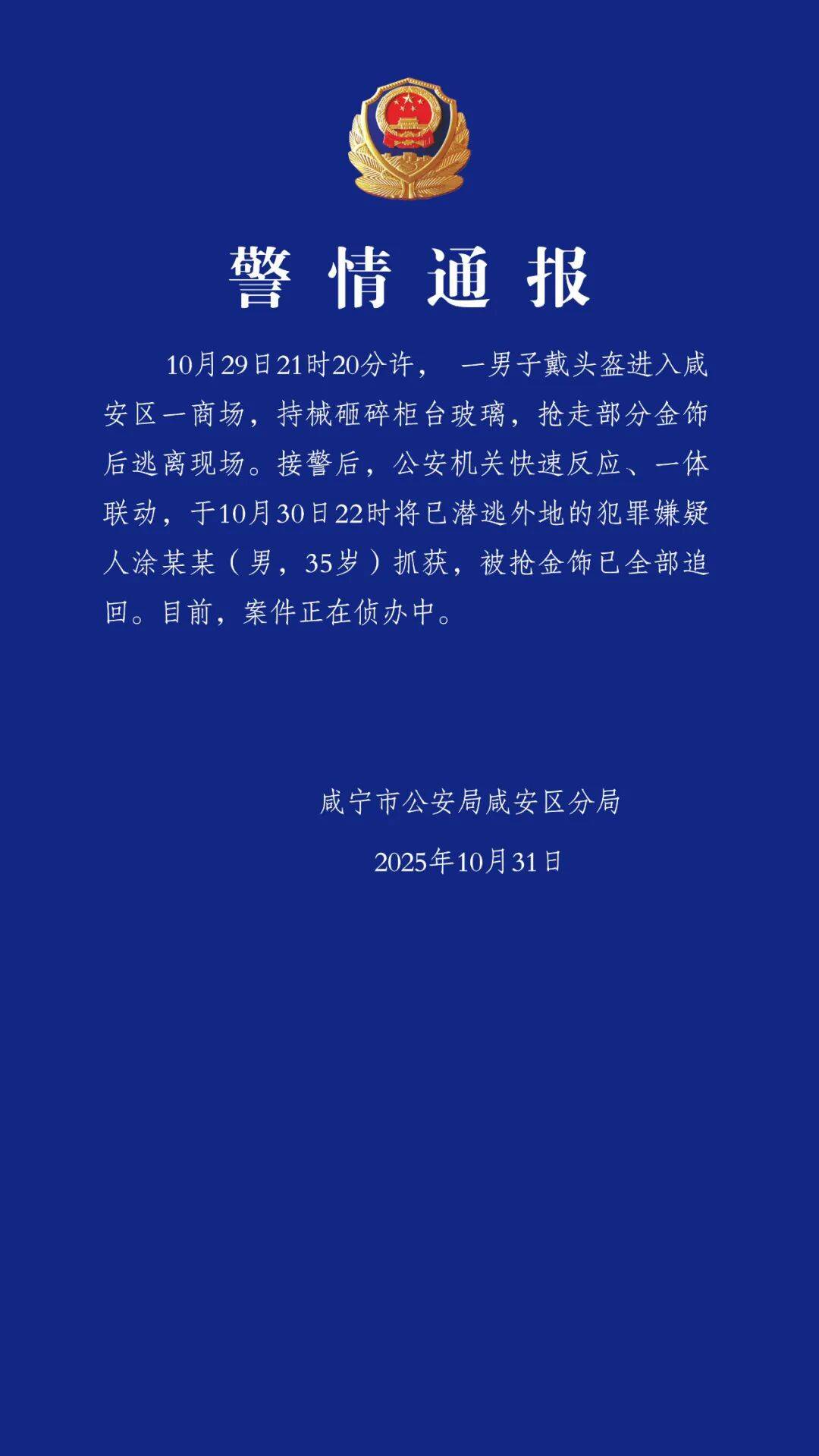 10月29日21时20分许,一男子戴头盔进入咸安区一商场,持械砸碎柜台玻璃,抢走部分金饰后逃离现场。接警后,公安机关快速反应、一体联动,于10月30日22时将已潜逃外地的犯罪嫌疑人涂某某(男,35岁)抓获,被抢金饰已全部追回。目前,案件正在侦办中。