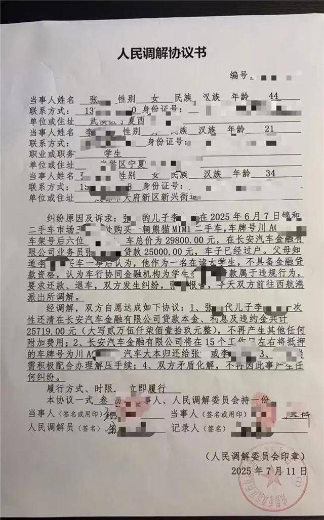 为了不让孩子的征信受影响,后在成都市双流区西航港街道人民调解委员会的调解下,李某母亲不得不先代为偿还本金、利息及违约金共计25719元,长安汽车金融有限公司将抵押的汽车大本归还给李某。但李某家人对这一解决方案并不满意。