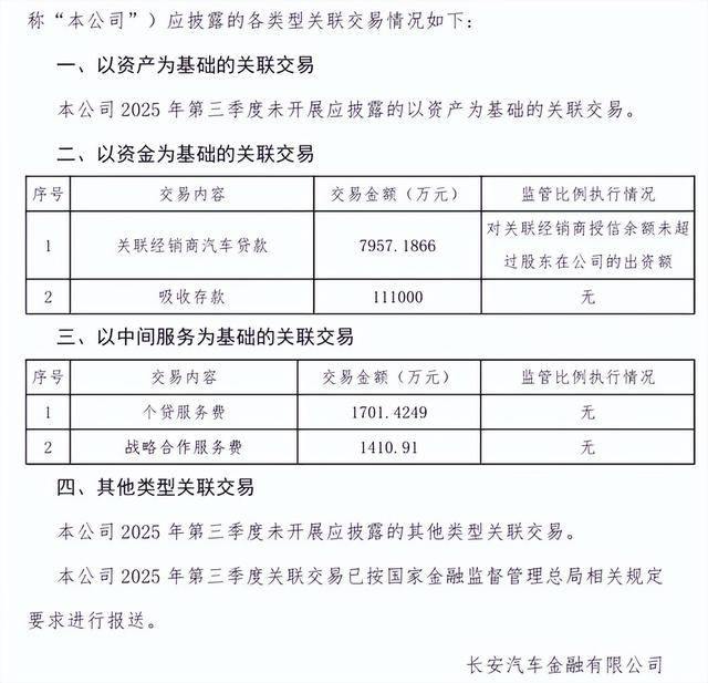 10月20日,长安汽车金融公开披露2025年第三季度关联交易信息公告,公告显示以资产为基础的交易中关联经销商汽车贷款交易金额为8千万元,比第二季度的5400万元环比增长48%,与2024年第三季度的507万元同比增长1478%。