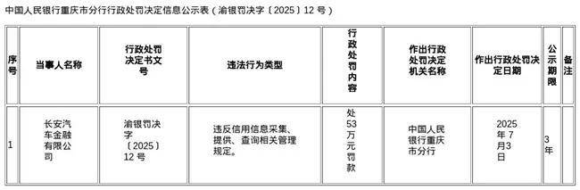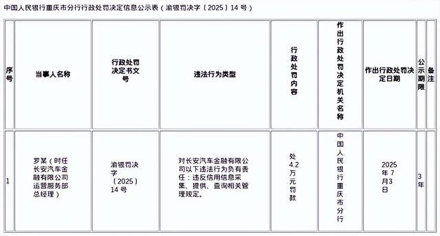 今年7月,中国人民银行重庆市分行的行政处罚决定显示,长安汽车金融因“违反信用信息采集、提供、查询相关管理规定”被重罚,时任运营服务部总经理及相关岗位工作人员同时被追责。