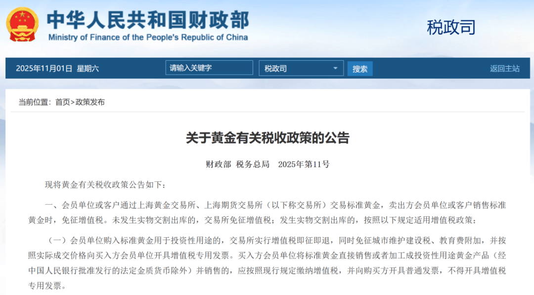 11月1日,财政部官网显示,财政部、税务总局发布《关于黄金有关税收政策的公告》(以下简称《公告》)。