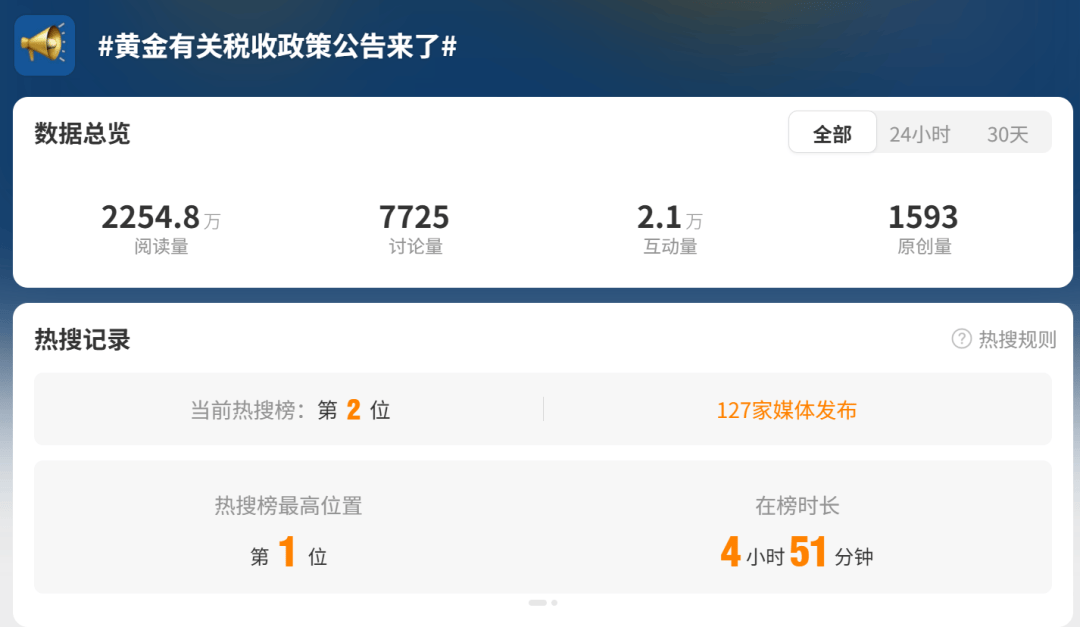 “黄金有关税收政策公告来了”的词条也登上微博热搜榜首位,引发大量投资者关注。