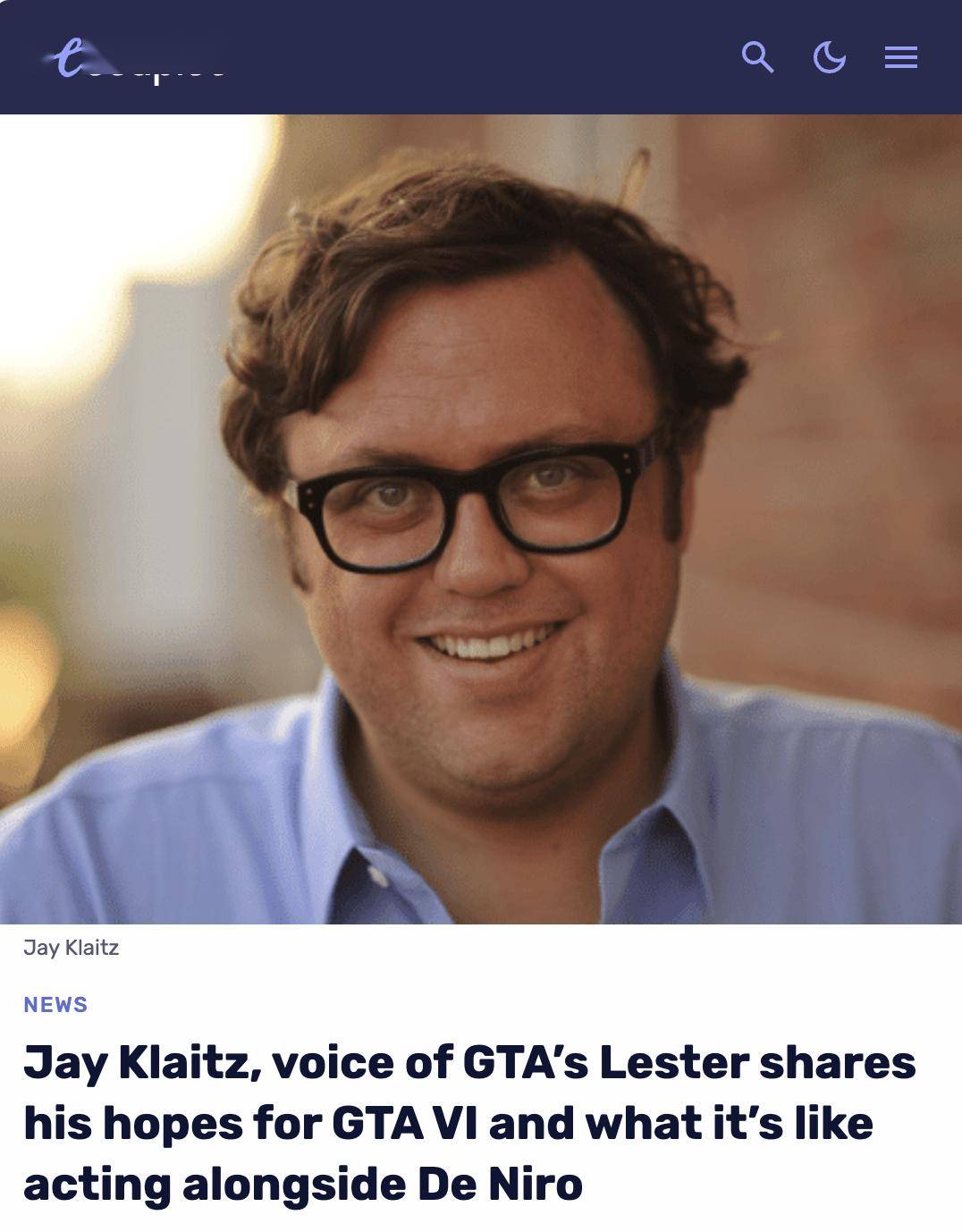 杰伊・克莱茨谈到了自己饰演莱斯特・克雷斯特的经历,以及与 12 年前首发的《GTA 5》三位主角的合作体验。