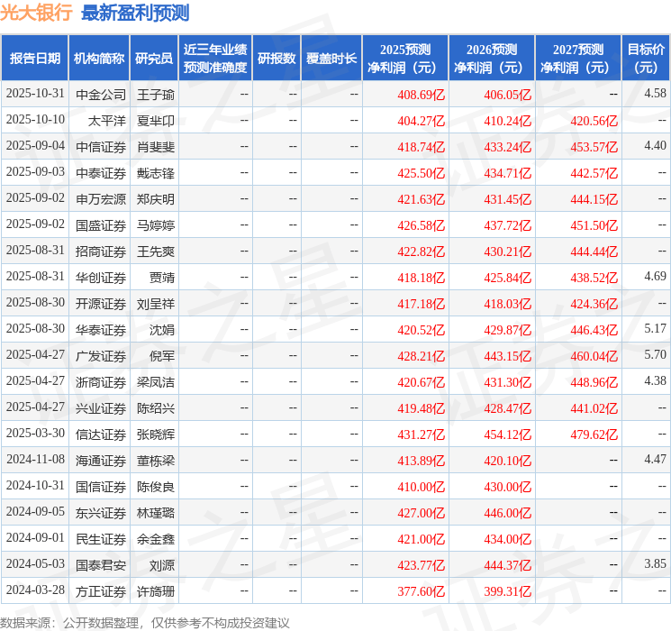 开源证券股份有限公司刘呈祥,吴文鑫近期对光大银行进行研究并发布了研究报告《光大银行2025年三季报点评:营收结构有亮点,财富管理质效提升》,给予光大银行增持评级。